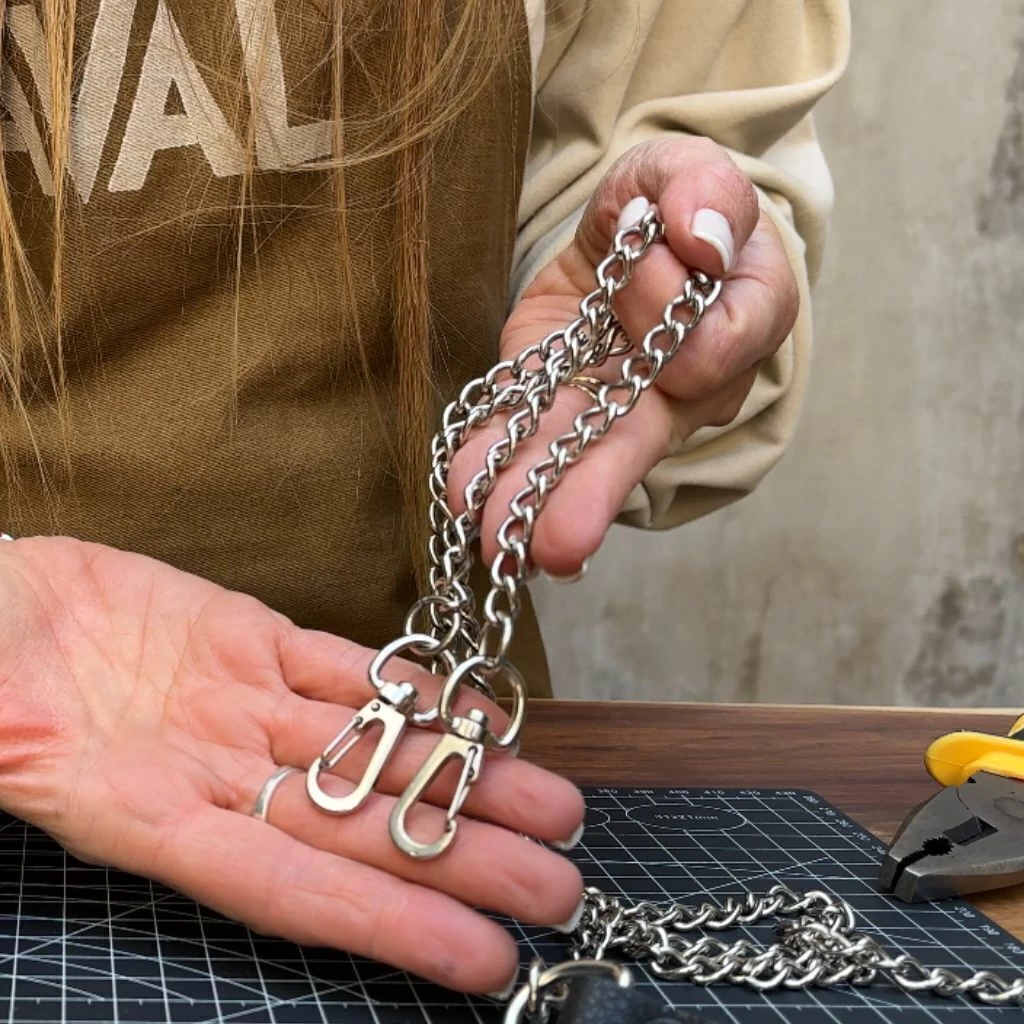 El kit incluye: el corte de cuero vacuno con la forreria ya pegada, las dos tiras de cuero vacuno que correponden al cierre y la tira de la correa, dos cadenas, 6 remaches, 2 alpinos, dos medialunas, 4 argollitas, 2 mosquetones y una cerradura puente.